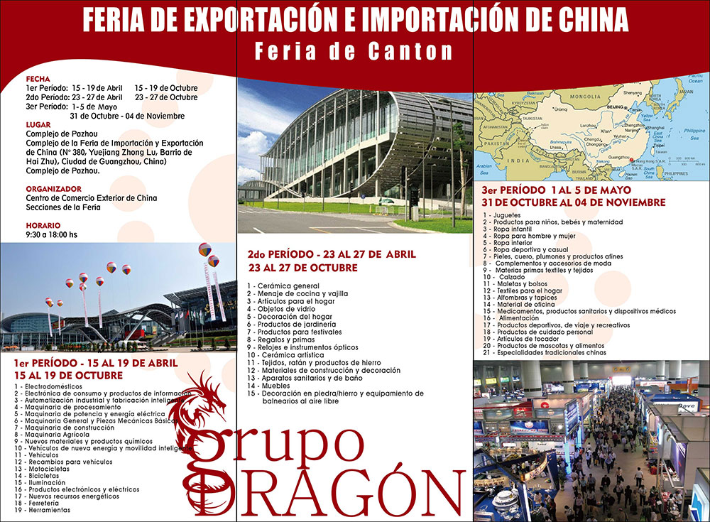 La Feria de Importación y Exportación de China (originalmente se llamaba la Feria de Artículos Chinos para la Exportación), que se denomina brevemente la Feria de Cantón, se inició en 1957 y se celebra en primavera y otoño de cada año en Guangzhou, China. Hasta la fecha, lleva exitosamente celebradas, sin interrupción, más de cien sesiones y se ha convertido en un gran encuentro general de comercio internacional de China, que cuenta con una historia más larga, una envergadura más grande, variedades más completas de artículos expuestos, con más participantes y mejores resultados de transacción del País, y ha sido calificada como “ la primera exposición de China”